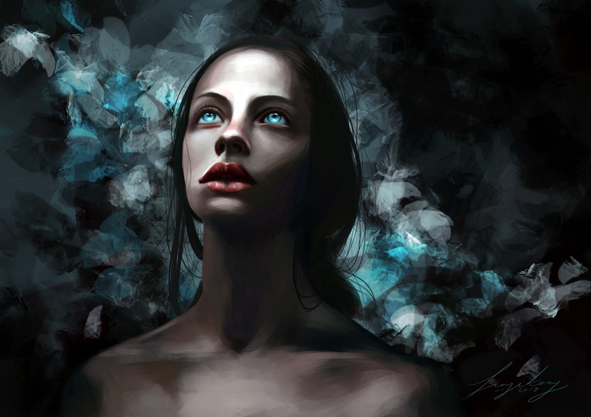 No one! Anyone! Sometimes my artworks are mirrored after images that inspire me, other times I make them up. Sometimes I will have a vision of what the outcome will be, other times I let my mind wander and my hands do the work. But one thing’s for certain—I rarely ever paint the people I know. Many of my friends and family have tried to have me paint them, but I prefer the freedom of painting no-one-anyone because my imaginary subjects can’t appear over my shoulder to tell me to make their nose a little smaller, or to remove the mole on their chin. The only ‘real’ person I’ve ever painted has been my grandmother, because she’s the most wonderful woman I know.